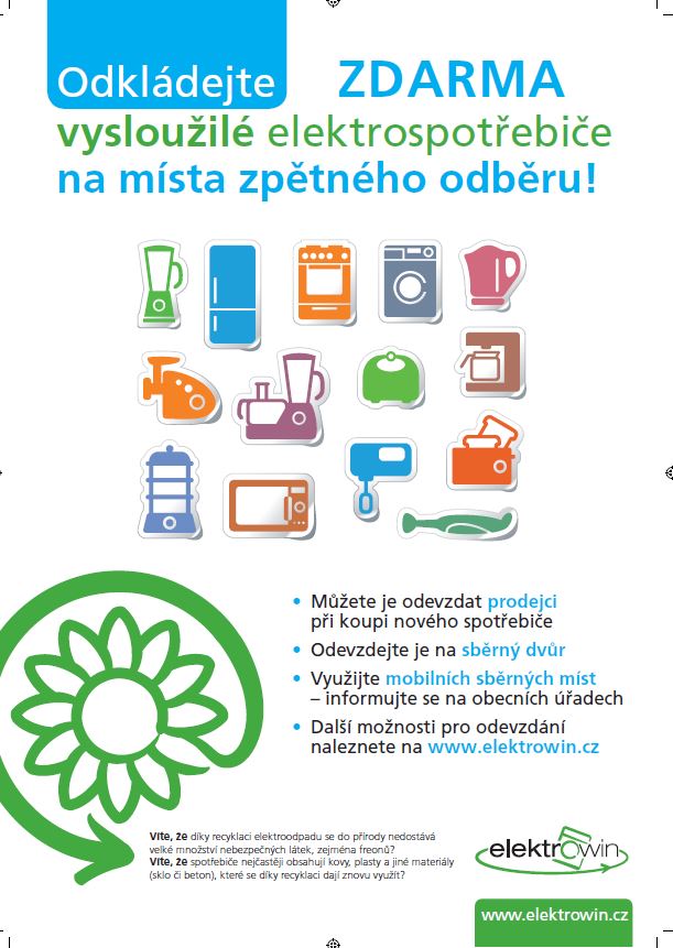 Pamatujte! Elektrozařízení obsahuje nejen dále využitelné materiály, ale také škodlivé látky. Odhozením do popelnice se elektrozařízení nedostanou k recyklaci, ale skončí nevyužité na skládce. Odevzdávejte spotřebiče na sběrný dvůr, nebo poslednímu prodejci při zakoupení nového!