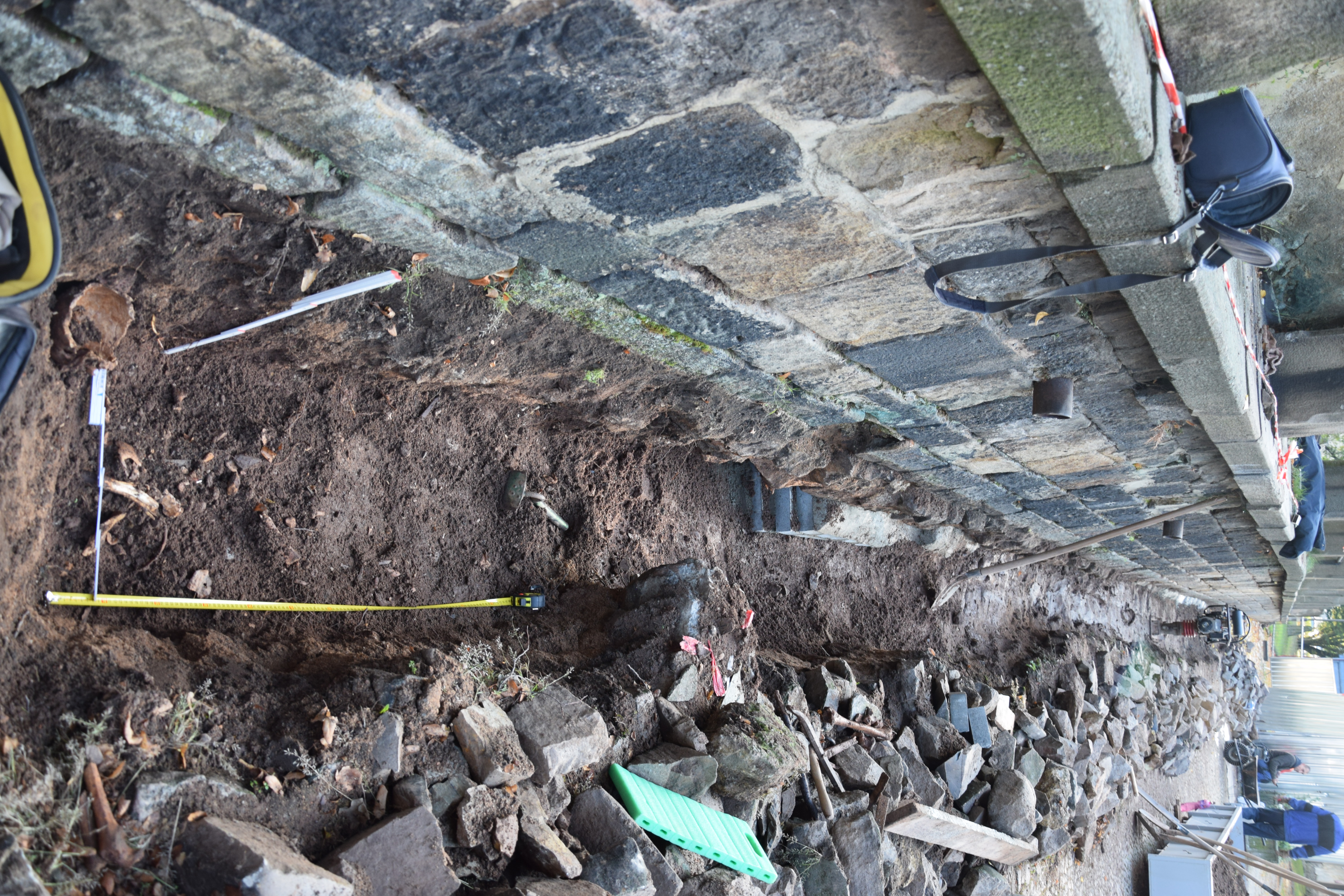 Foto K. Blažková - Pohled od západu na úsek zárubní zdi s narušenými lidskými ostatky.