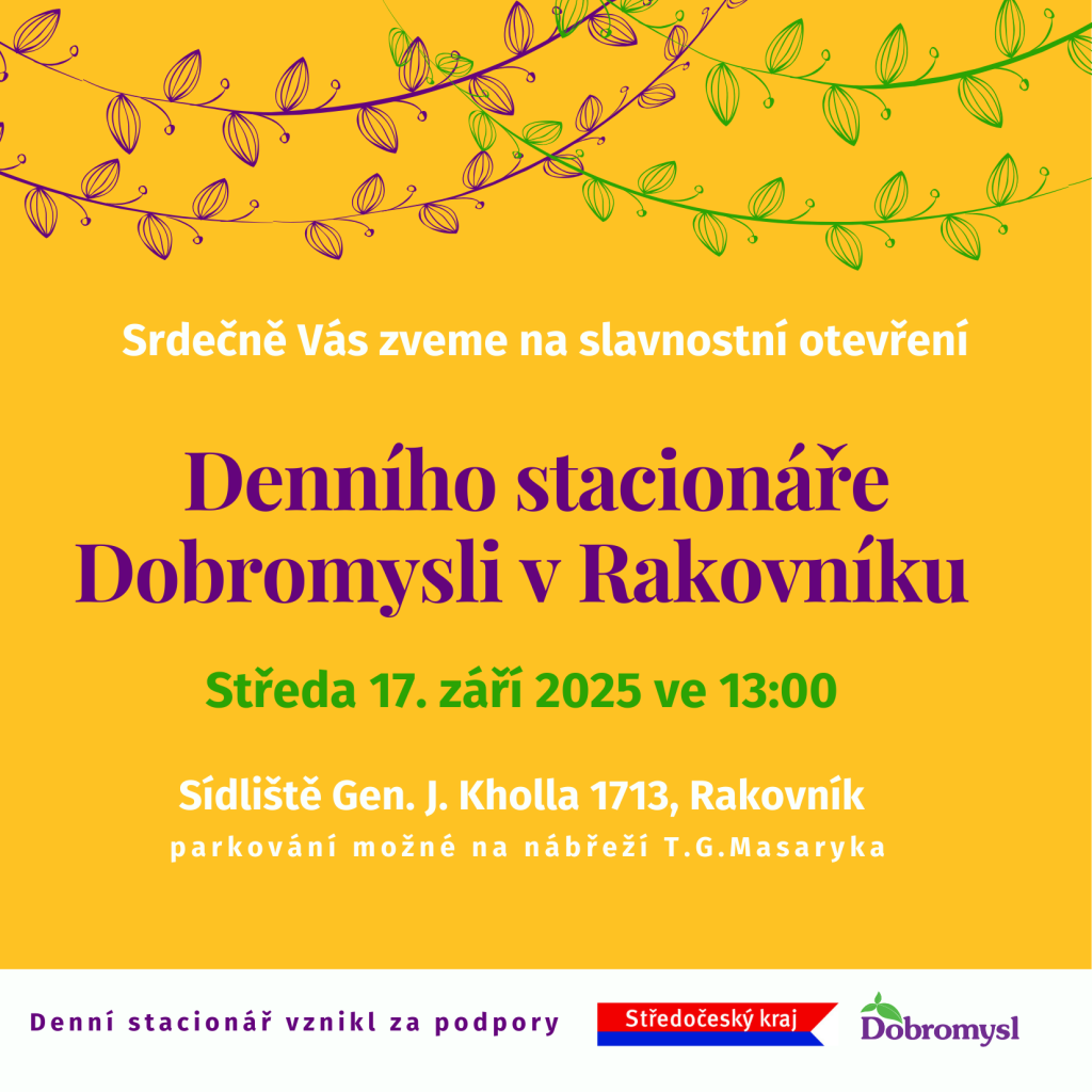 Jste srdečně zváni na slavnostní otevření nového denního stacionáře Dobromysli v Rakovníku, které proběhne ve středu 17. září 2025 ve 13:00 hodin.