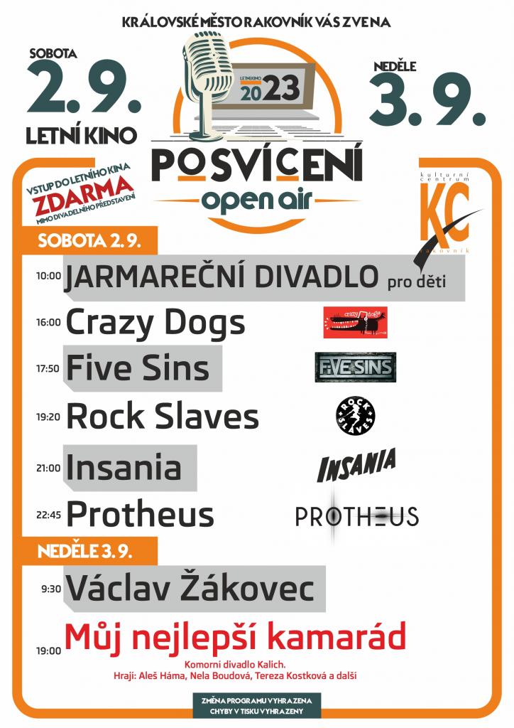 - V Letním kině proběhne Posvícení OPEN AIR 2023, kde vystoupí v sobotu několik kapel a v neděli zde zahraje k tanci a poslechu Václav Žákovec a večer proběhne divadelní představení Komorního divadla Kalich s názvem Můj nejlepší kamarád.