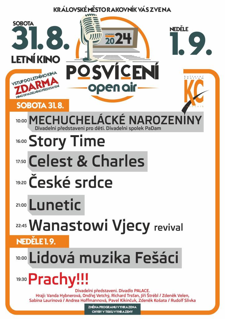 - v letním kině proběhne Posvícení OPEN AIR 2024, kde vystoupí v sobotu několik kapel a v neděli zde zahrají k tanci a poslechu Fešáci a večer proběhne divadelní představení Divadla PALACE s názvem Prachy!!!