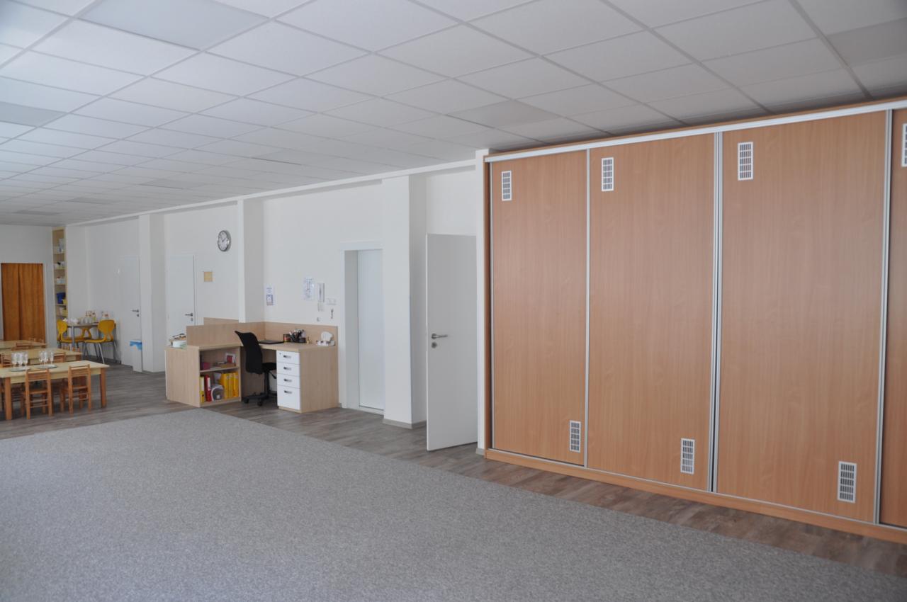 - Rekonstrukce herny o rozměrech 97,4 m2 zahrnovala provedení nových rozvodů elektroinstalace, položení nové podlahové krytiny z vinylových dílů, opravy omítek s přeštukováním a novou malbu.