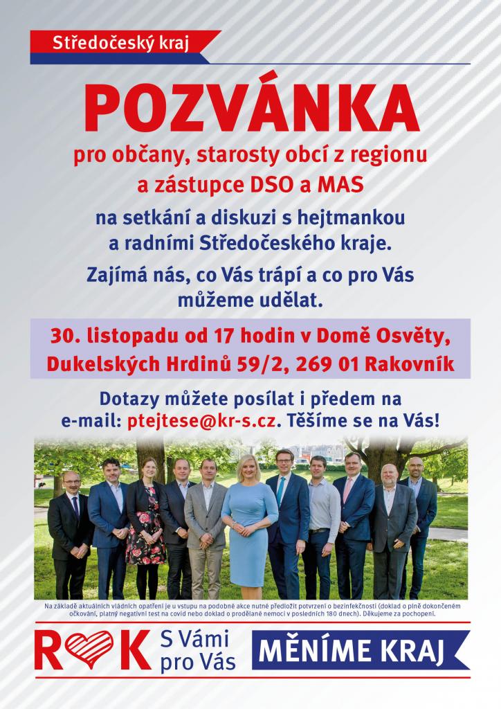 v souvislosti s blížícím se konáním výjezdu hejtmanky Středočeského kraje paní Petry Peckové a dalšími členy Rady SK, který se uskuteční v úterý 30. listopadu v Rakovnickém regionu, si Vás dovolujeme pozvat k setkání a diskuzi s hejtmankou a radními Středočeského kraje.