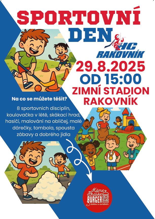Na Zimním stadionu v Rakovníku se 29. srpna 2025 od 15:00 koná Sportovní den, který nabídne širokou škálu aktivit pro všechny věkové skupiny. Účastníci se mohou těšit na 8 různých sportovních disciplín, letní koulovačku a skákací hrad. Kromě toho budou připraveny hasičské ukázky, malování na obličej, malé dárečky a tombola, což slibuje spoustu zábavy a dobrého jídla pro všechny návštěvníky.