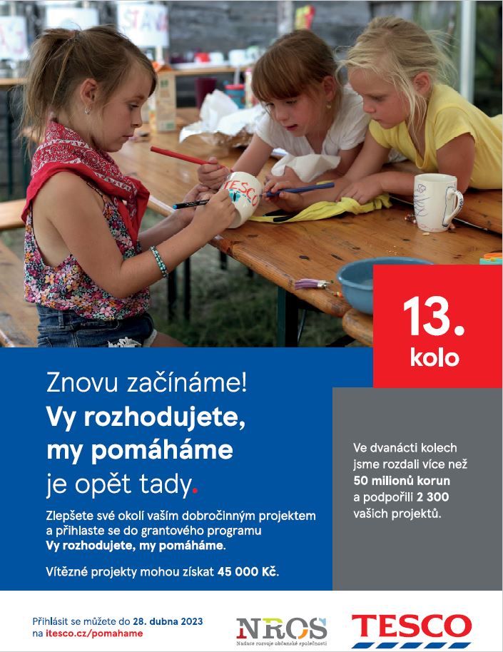 Rádi bychom Vás informovali o grantovém programu Vy rozhodujete, my pomáháme, který probíhá ve všech obchodech Tesco. Cílem programu je podporovat místní společenství prostřednictvím grantů poskytovaných neziskovým a příspěvkovým organizacím, aby mohly realizovat projekty, které přispívají ke zlepšení kvality života v okolí našich obchodů.